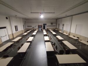 Tische sind vorhanden. Neben dem Tisch ist noch Platz für einen Kleiderständer.